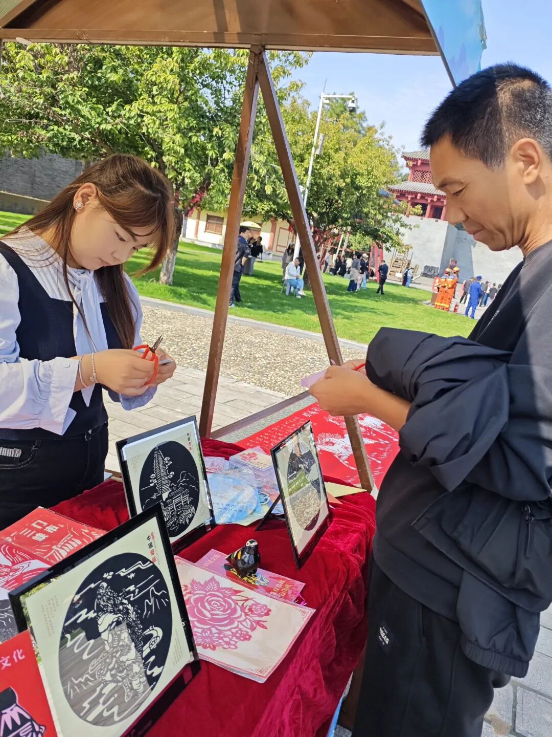 迟骋老师带领团队以套色《紫气东来》剪纸作品一边向游客讲解豫西剪纸的历史渊源与技艺特色,一边现场展演非遗绝活儿——剪刀在彩纸间灵活穿梭,转瞬之间,花鸟、祥云、人物等各式图案便跃然纸上,引得游客纷纷驻足观赏、拍照留念。不少游客主动参与体验,在师生们手把手的悉心指导下,从学习握剪、运剪技巧,到完成简单造型裁剪,亲身感受非遗技艺的独特魅力。“亲手剪纸才知道这门手艺的精妙,也真切触摸到了传统文化的温度。”一位体验后的游客感慨道。