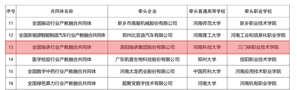 近日,河南省教育厅公布了首批18个行业产教融合共同体名单,学院作为牵头职业学校建设的全国轴承行业产教融合共同体成功入选,标志着我院在深化产教融合、校企合作的道路上迈出了更加坚实的步伐。
